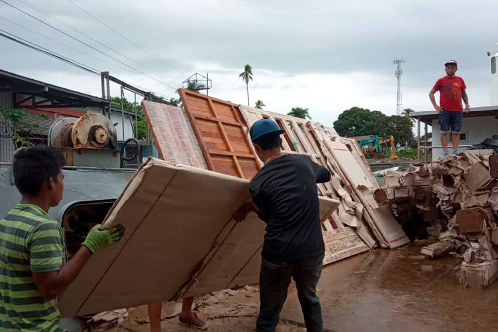 The unloading of the first container on the mainland and transportation to our island by barge took sixteen hours! The rain drizzled all day making work miserable. But the real trouble came about 3:00AM, within a half hour of finishing up, when the rain came down in sheets, soaking everything.
